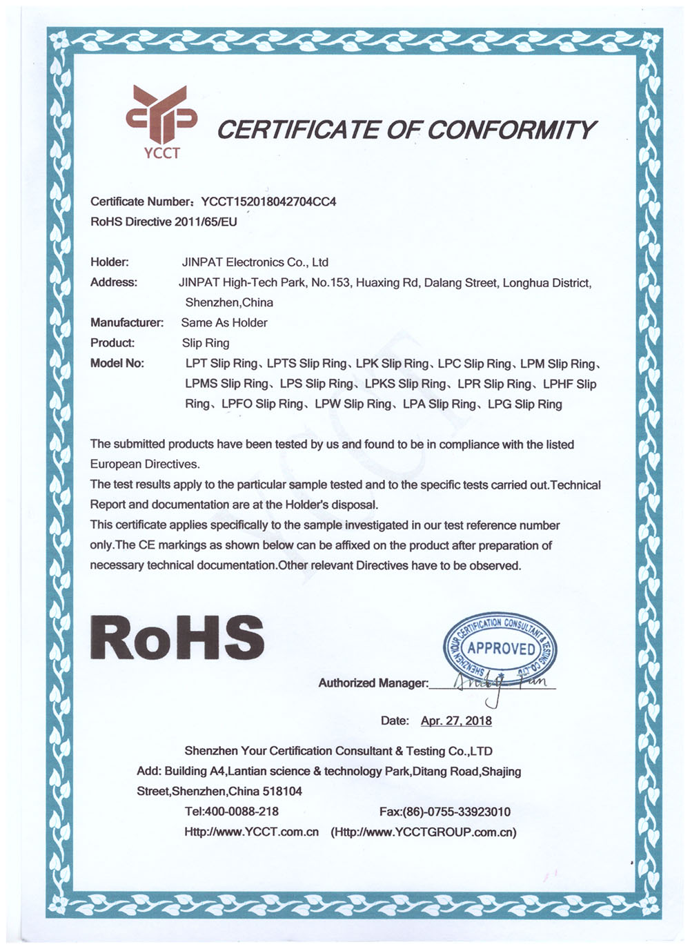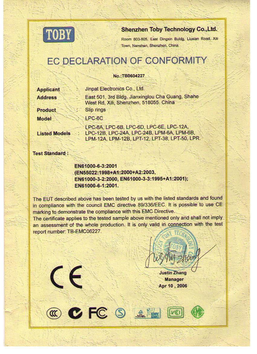 晶沛通過(guò)了歐盟CE認(rèn)證病入膏肓、FCC認(rèn)證百发百中,避无可避、SGS認(rèn)證落地生根、BV“船級(jí)社”認(rèn)證、防爆認(rèn)證等多項(xiàng)認(rèn)證,生產(chǎn)的導(dǎo)電滑環(huán)都符合RoHS環(huán)保要求,先后被授予“國(guó)家高新技術(shù)企業(yè)”稱(chēng)號(hào),目前已獲得45項(xiàng)專(zhuān)利,其中發(fā)明專(zhuān)利6項(xiàng)。